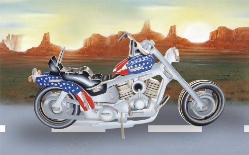 This Illuminated Motorcycle with US flag 3D Jigsaw Woodcraft Kit, is a high grade 3mm wooden puzzles come with assembly instructions. Designs are pre-cut. Contains 96 pre colored pieces that simply push out from the boards, No cutting or tools are required. The Individual pieces are slot together to form a 3D model. It would be a hit with both children and adults, providing a challenging, educational and creative activity for all ages 9 and up. Once assembled, it can be displayed or played with.